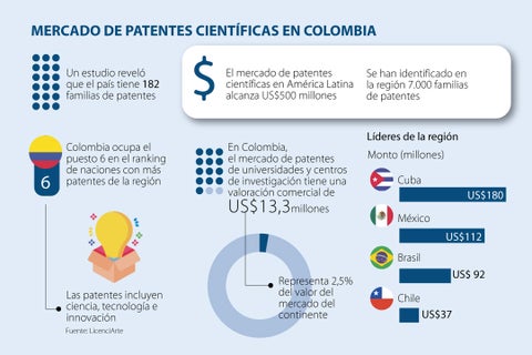 El estudio encontró que las patentes científicas en Colombia están valoradas en US$13,3 millones y representa 2,5% del valor del mercado en América Latina. También se estableció que la nación cuenta con 182 familias de patentes, por delante de otros países como Perú, Costa Rica, Uruguay y Panamá.