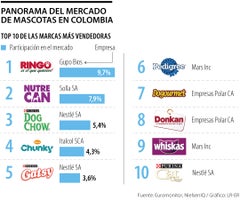 Ya en el tercer lugar está Dog Chow, de Nestlé con su división Purina, de alimentos para mascotas, con una participación de 5,4%. Este competidor cobra relevancia cuando se mira el top 10, en el que tiene otras dos marcas: Gatsy y Cat Chow.